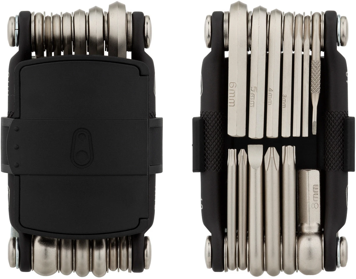 Das M13 Multitool von crankbrothers ist ein kompaktes Miniwerkzeug mit 13 Funktionen, das Dir bei einer Panne aus der Not helfen kann. Neben 12 verschiedenen Schraubwerkzeugen ist auch ein Einführungstool für Tubeless-Flicken enthalten. Zudem verfügt das Tool über eine abnehmbare Aufbewahrungsbox, in der bereits ein Set mit fünf Tubeless-Flicken vorhanden ist. Das Tool ist aus beständigem Stahl gefertigt.