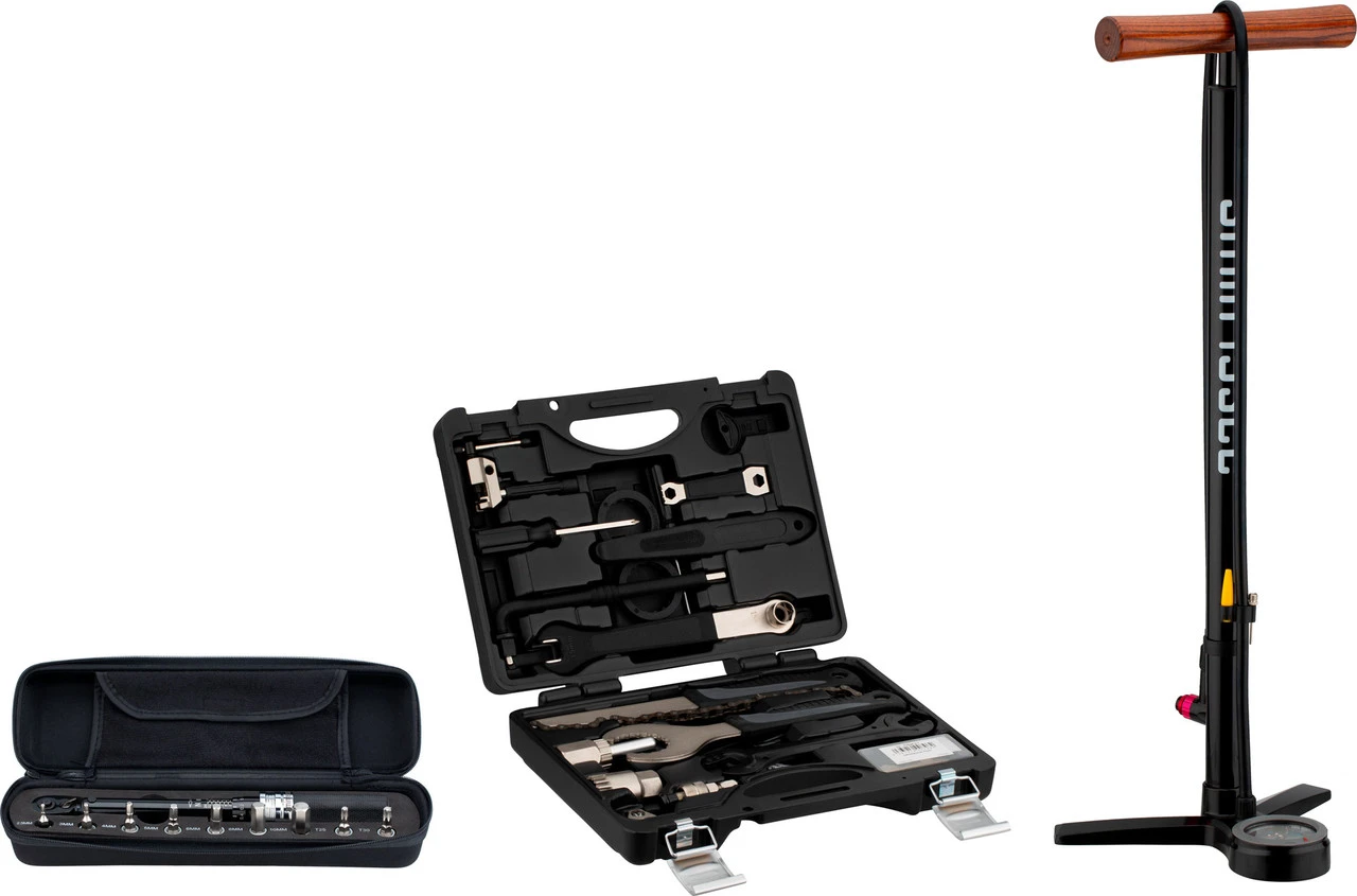 1 x Fahrrad-Werkzeugkoffer BTK-2 mit Inhalt1 x Drehmomentschlüssel Premium mit Bit-Set und Aufbewahrungscase1 x Standpumpe Aluminium
