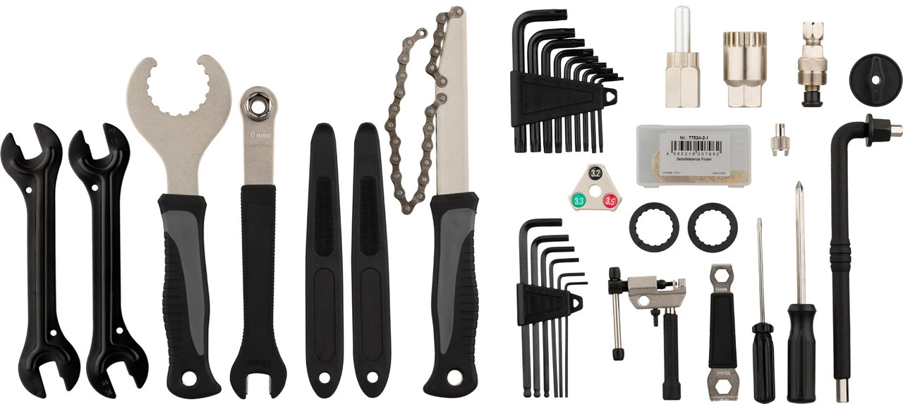 Kette / Kassette: Kettennieter, Kettenpeitsche, Kassettenabzieher für Schnellspanner und Steckachse, auch passend für Center-Lock-Bremsscheiben bei SchnellspannnabenKurbel / Innenlager: Schlüssel für Hollowtech II Kurbelschrauben, Innenlagerabzieher, Innenlagerschlüssel, auch passend für Center-Lock-Bremsscheiben bei Steckachsnaben, Shimano SM-BBR60 Adapter, Shimano SM-BB9000 BB93 Adapter, Kurbelabzieher, Kettenblatt-SchraubenschlüsselReifen / Laufrad: Reifenheber (Paar), Flickset, Ventilschlüssel AV und SV, Speichenschlüssel für 3,2 mm (0.127“) Nippel, Speichenschlüssel für 3,3 mm (0.130“) Nippel, Speichenschlüssel für 3,4 mm (0.136“) NippelPedal / Nabe: Pedalschlüssel, Konusschlüssel 13 mm, Konusschlüssel 14 mm, Konusschlüssel 15 mm, Konusschlüssel 16 mmSchraubwerkzeuge: Schraubendreher mit Wechselklinge: flach 5 mm / Phillips, Schraubendreher 3 mm, Innensechskant 2 mm / 2,5 mm / 3 mm / 4 mm / 5 mm / 6 mm / 8 mm, Torx T10 / T15 / T20 / T25 / T30 / T40 / T45 / T50Weitere Informationen zum Werkzeugkoffer