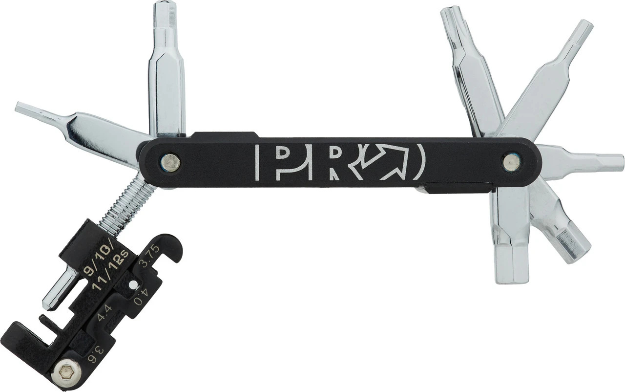 Das Performance 13 Minitool von PRO bietet Dir 13 Funktionen an einem kompakten Werkzeug. Es ist mit diversen Innensechskantschlüsseln, einem Torx T25 und verschiedenen Nippelspannern ausgestattet. Ein Kettennieter für 9- bis 12-fach-Ketten sowie ein Ventilschlüssel sind ebenfalls mit dabei.