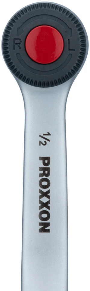 Die 1/2″ Standardratsche von Proxxon besitzt eine direkte Umschaltfunktion auf dem Ratschenmechanismus. Mehrere der 52 Zähne rasten gleichzeitig ein und übertragen so extrem hohe Drehmomente. Die Einsätze können ganz einfach durch Knopfdruck gelöst werden. Kopf und Schaft sind aus einem Stück CrV-Stahl geschmiedet, 2x vernickelt und matt-verchromt. Der Griff ist aus öl- und säurefestem TPR (Thermoplastic Rubber) gefertigt und mit einer praktischen Bohrung zum Aufhängen versehen.