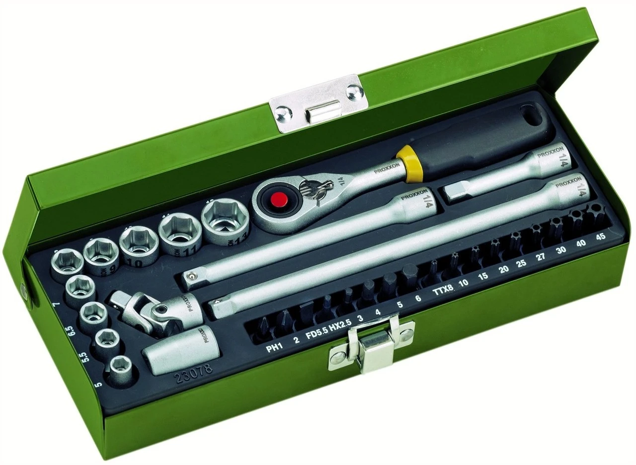 Lieferumfang:1 x Steckschlüsselset Proxxon 32-teilig1 x Stahlkasten Proxxon