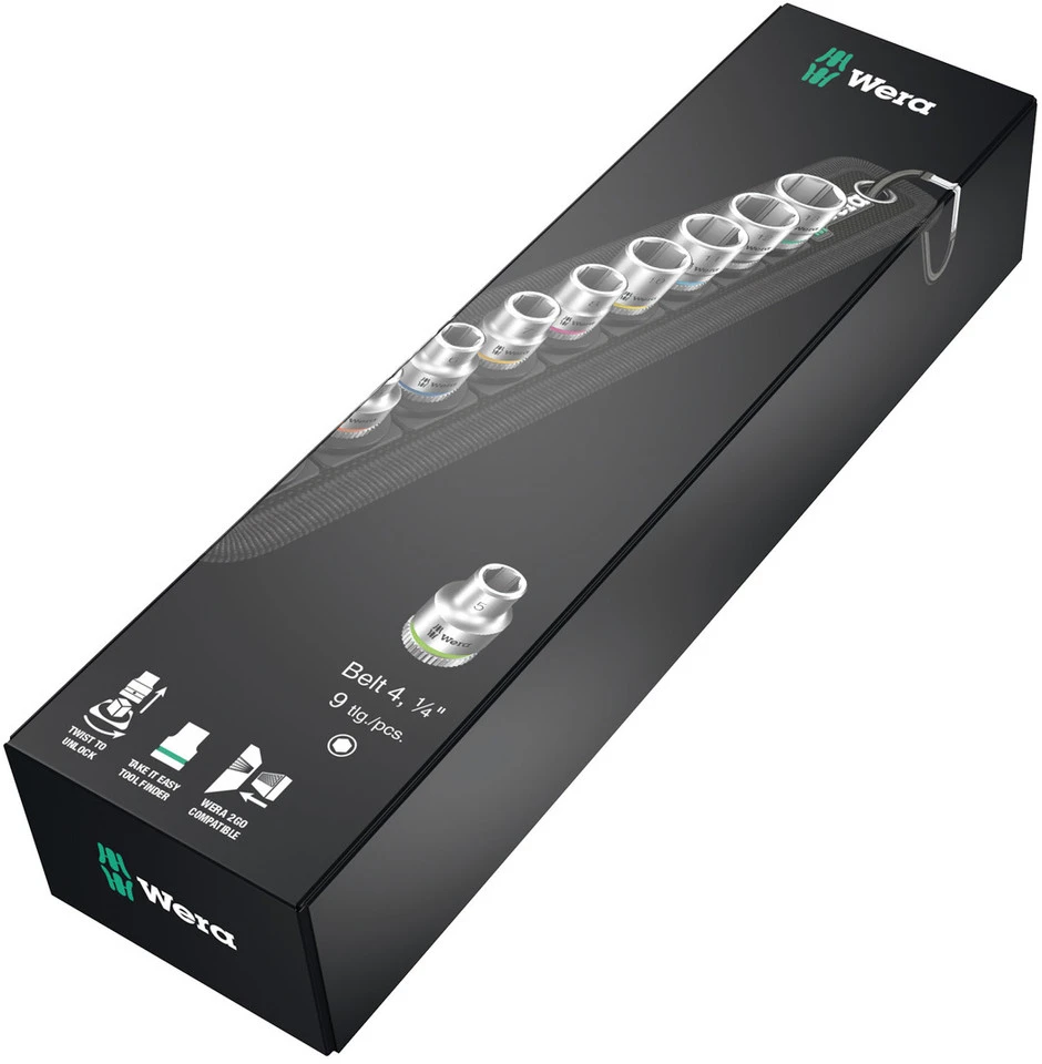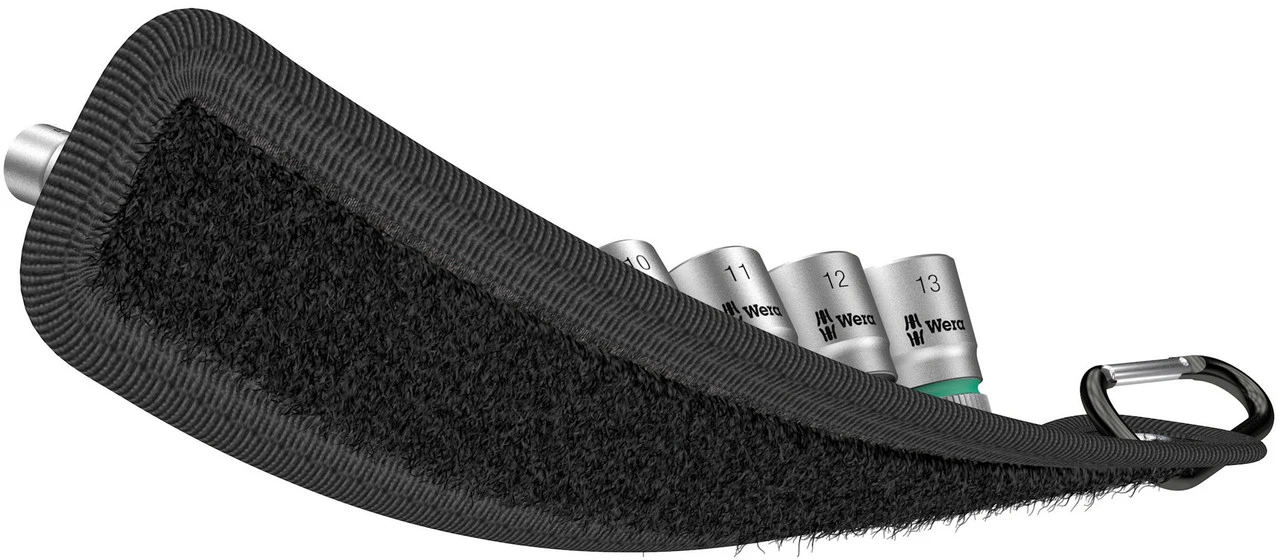 Der Belt A 4 Zyklop Steckschlüsseleinsatz-Satz von Wera besteht aus einem robusten Textilgurt mit einem integrierten Drehmechanismus für neun Nüsse. Mit dem „Take it easy“-Werkzeugfinder mit farbiger Kennzeichnung nach Größen ist die Wahl des benötigten Bits ein Kinderspiel. Die Rückseite des Gurtes besteht aus Vlies, dieses hält hervorragend am selbstklebenden Klettstreifen, den Du an der Wand, einem Regal oder einem Werkstattwagen anbringen kannst. Mit dem Karabinerhaken lässt sich der Gurt auch an Deiner Gürtelschlaufe oder an einer Tasche anbringen. So ist der Wera Belt A 4 jederzeit griffbereit