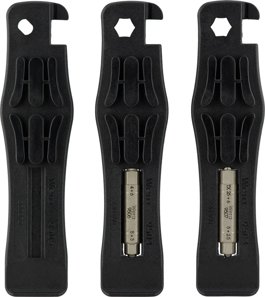 Das Bicycle Set 15 von Wera besteht aus drei glasfaserverstärkten Kunststoff-Reifenhebern und zwei Kombinationsbits. Einer der Reifenheber lässt sich als Ventilwerkzeug verwenden, die anderen beiden verfügen über eine 1/4″ -Bit-Aufnahme und können so zum Schraubwerkzeug umfunktioniert werden. Die 4-in-1-Bits kombinieren vier Innensechskantgrößen bzw. drei Innensechskantgrößen und einen Torx T25.