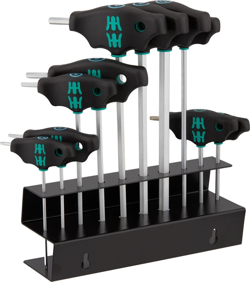 Spezifikationen:Funktion:SchraubwerkzeugWerkzeugtyp:SchraubendreherAusführung:Torx, InnensechskantTechnische Daten:Material:Stahl, KunststoffFeatures:10-teiliges Quergriff-Schraubendreher-Set für Fahrradanwendungensicherer Halt der Schraube auf dem Werkzeug durch Haltefunktion am langen SchenkelInnensechskant: 2,5 (ohne Haltefunktion), 3, 4, 5, 6, 8, 10Torx: T10, T20, T25hochwertige Oberflächenvergütung für lang anhaltenden Korrosionsschutzermüdungsfreies Arbeiten und hohe Kraftübertragung durch ergonomischen 2-Komponenten-Griff mit FingermuldenMetall-Rack zur sicheren und übersichtlichen AufbewahrungHerstellernummer:05004174001